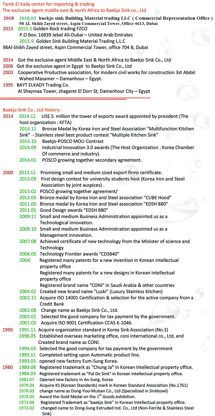 2006 Got the exclusive agent in Egypt to Baekjo Sink Co., Ltd